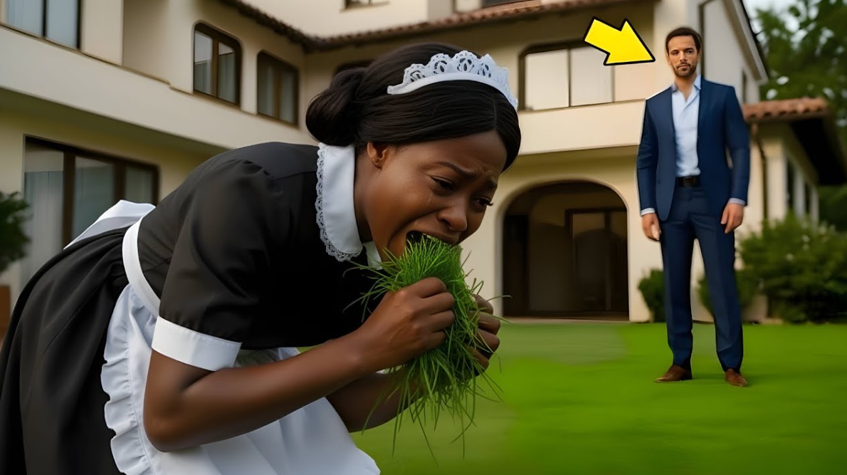 A billionaire thought he ruled a perfect household—until one afternoon, he walked into his garden and saw his maid on her knees, eating grass with tears streaming down her face. At first, he thought she’d lost her mind. But the truth was far worse: a cruel rule enforced under his own roof, and a sacrifice so heartbreaking it brought him to his knees.
