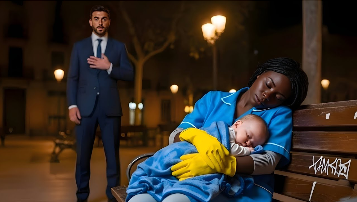 And then he saw her—his maid, humble, tired, wrapped in an old blanket, sleeping on a wooden bench beside the fountain. In her arms, his baby. The sight struck him like lightning. Her shawl was wrapped around the child, shielding it from the cold. Her own hands were trembling, but she never let go.