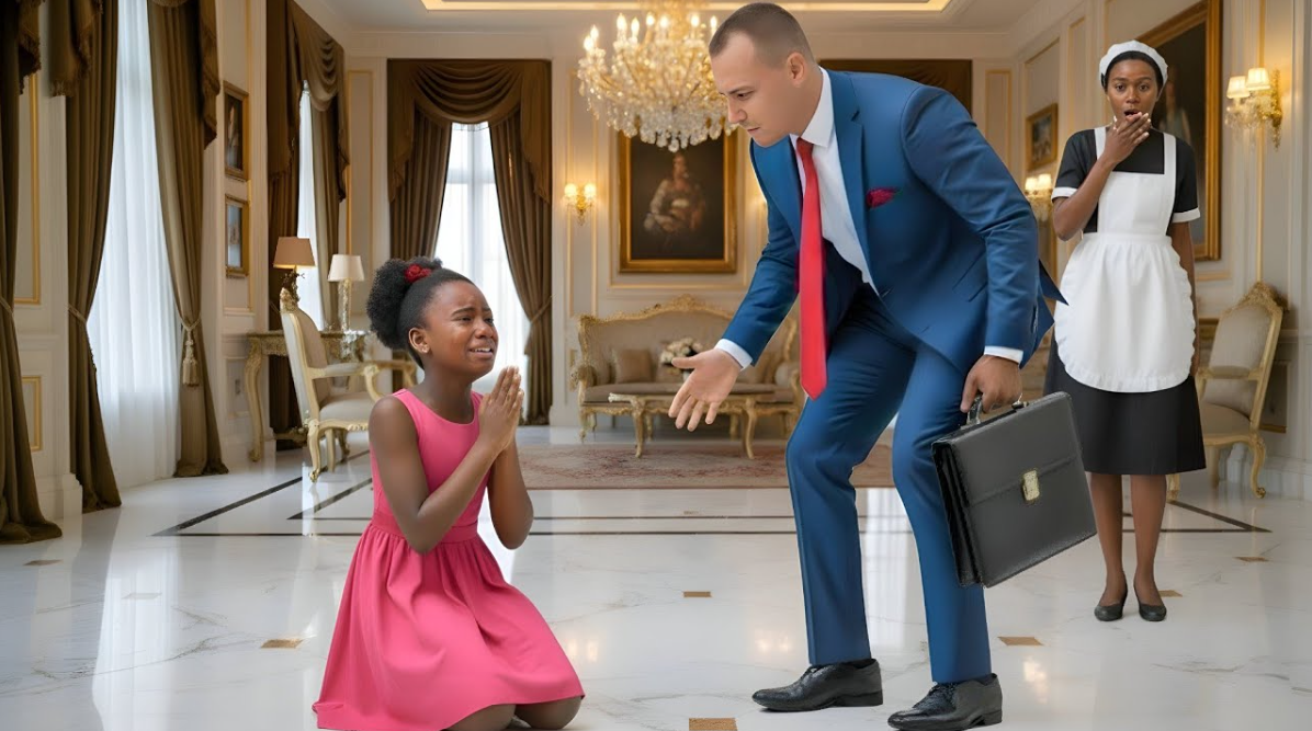 Amira, in her bright red dress, darted across the polished floor and dropped to her knees in front of him. Her hands clasped together, trembling. Tears streamed down her young face as her voice cracked with desperation.