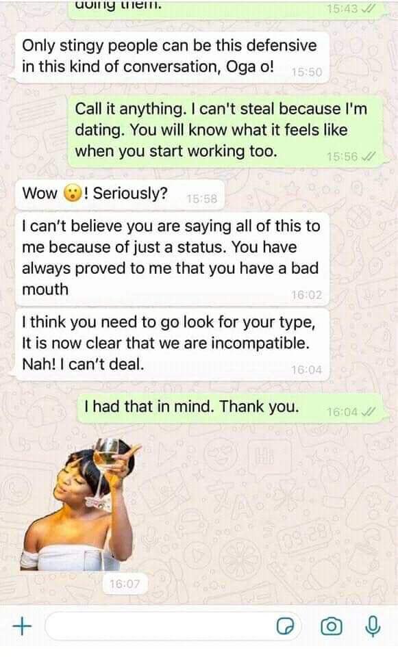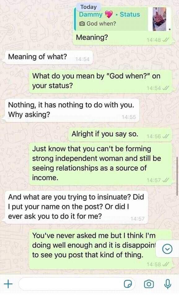 Her boyfriend then questioned he about it via WhatsApp and it escalated into an argument about her not being contented with what he gives her.