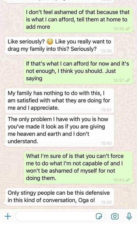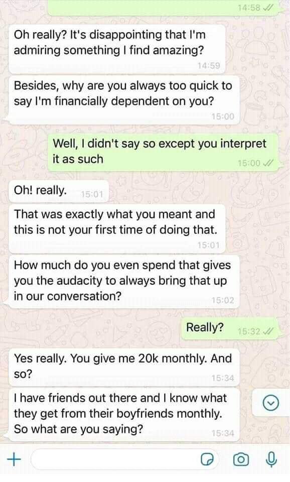 She then berated him for being proud that he gives her only N20k whereas her friends get more from their boyfriends.